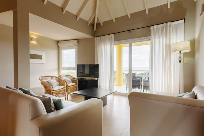 Living comedor y dormitorio principal con vista al mar panorámica.
